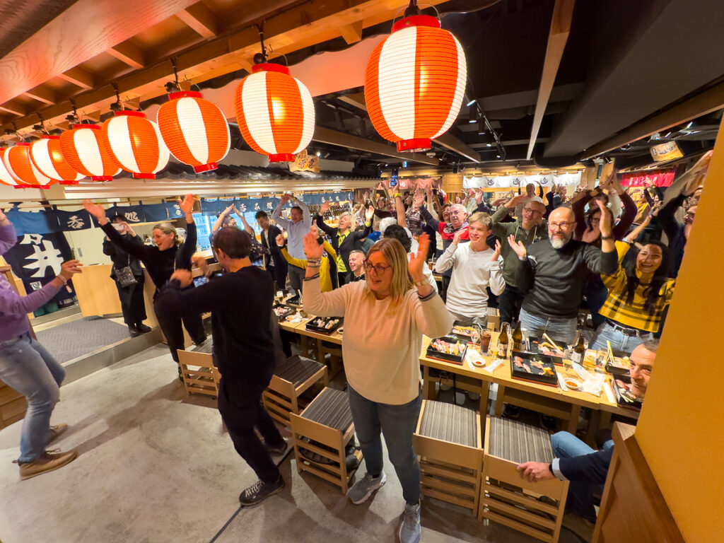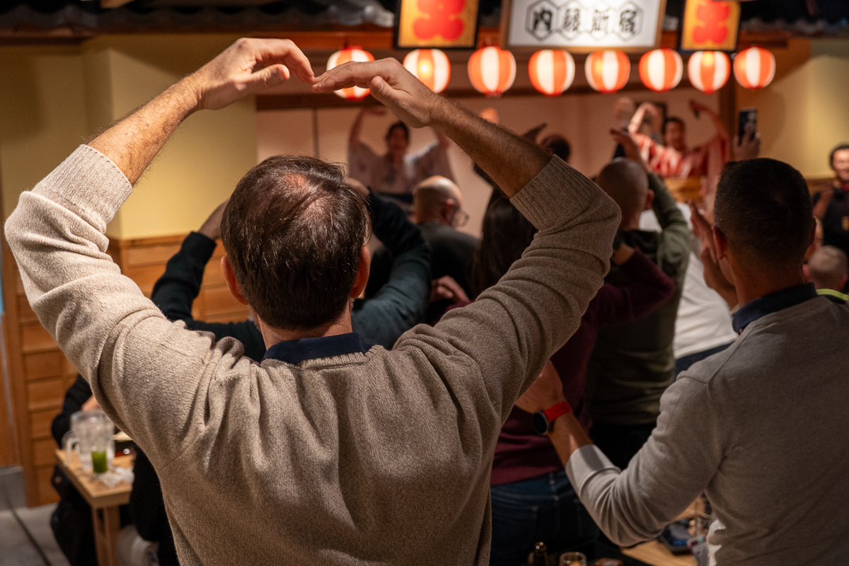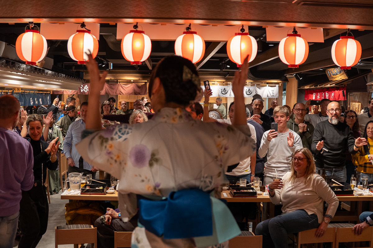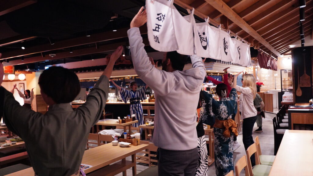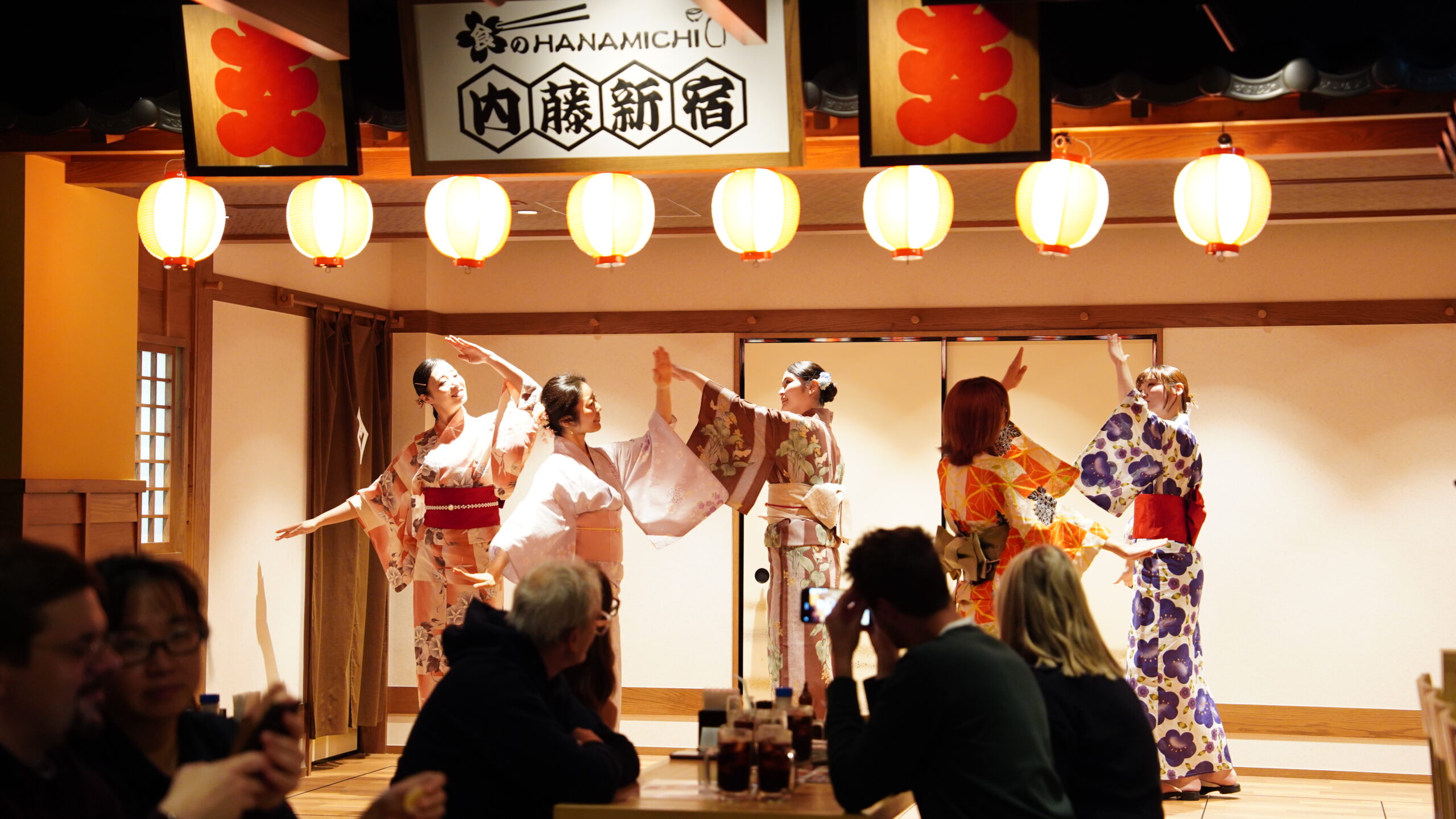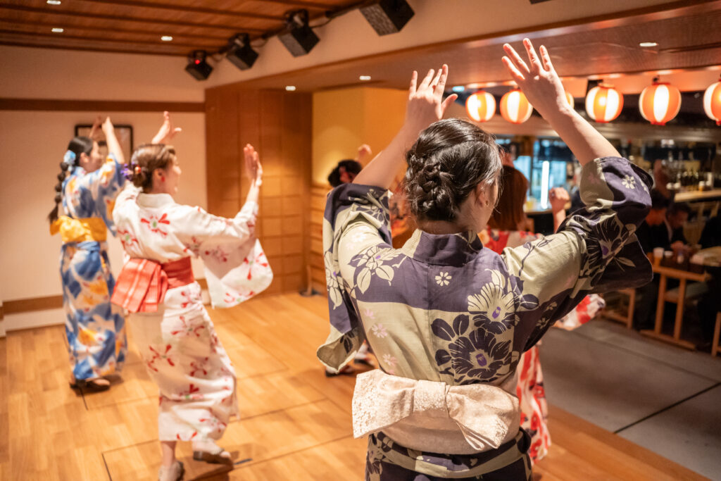 盆踊り居酒屋では他の居酒屋と違い、踊り手たちと一緒に盆踊りをします!日本の伝統的な舞踊ではありますが、プロのレクチャーのもと、みんなで楽しく踊ることができます。振り付けは同じ動作を繰り返すだけなのでとても簡単!踊り手たちと一緒に記念撮影もできます!